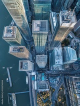 Aerial bird's eye view photo taken by drone of famous Canary Wharf skyscraper complex, Isle of Dogs, London, United Kingdom
