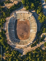 Aerial drone photo of iconic ancient Panathenaic stadium or Kalimarmaro birthplace of the original Olympic games, Athens historic centre, Attica, Greece
