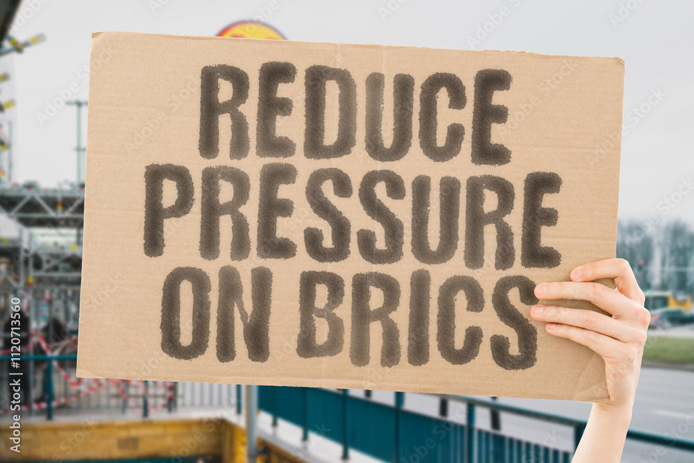 Banner reading 'Reduce pressure on BRICS' highlighting economic tensions. Diplomacy. Trade. Globalization. Partnership. Reform. Stability. Opportunity