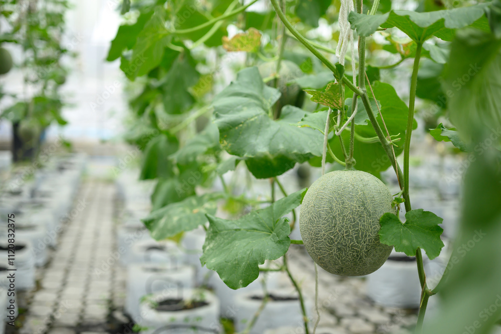 Melon fruit hanging on plant in greenhouse, Organic farm
