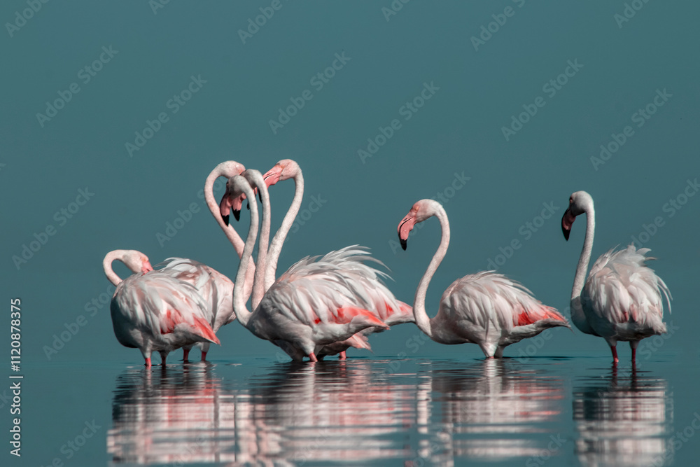 African wild birds. A flock of great flamingos on the blue lagoon against the bright sky