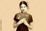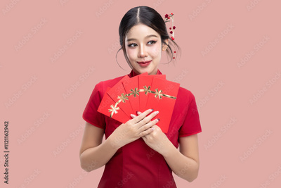 Beauty Asian woman in red Cheongsam Chinese traditional dress celebrating with lucky red envelopes on Chinese New Year festival isolated on pink background.