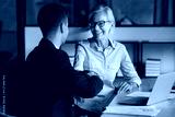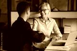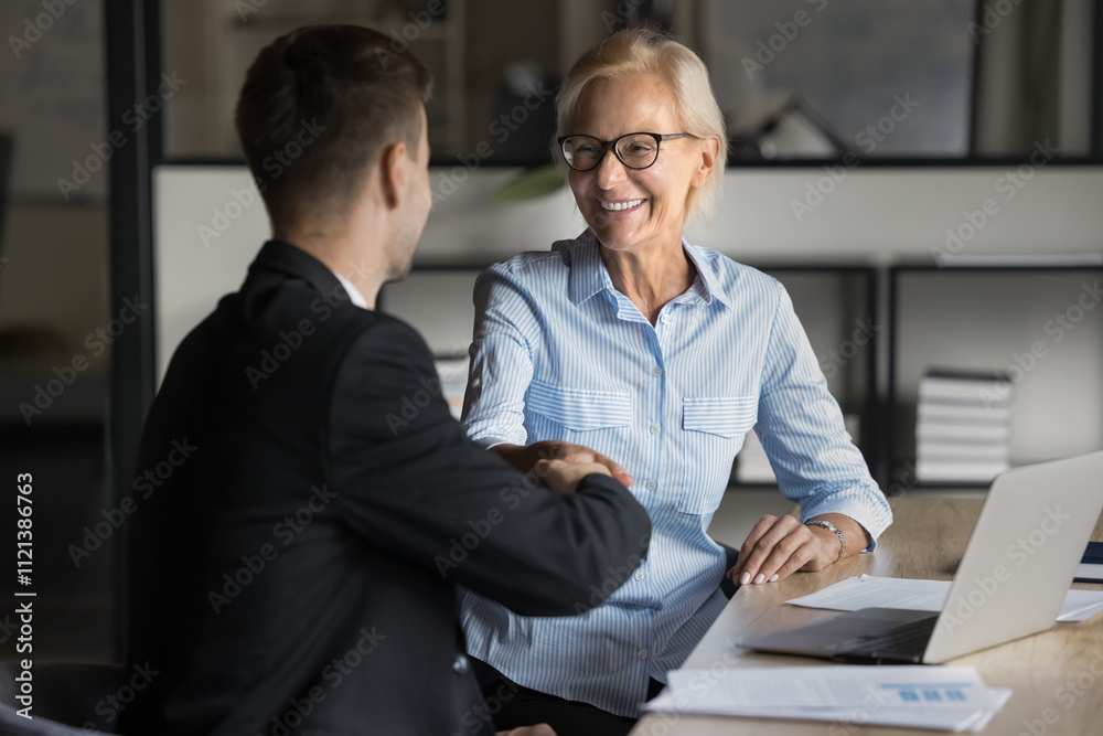 Happy middle-aged 55s businesswoman and younger business partner shaking hands express mutual respect, marking conclusion of business deal or agreement, start successful collaboration and partnership