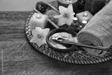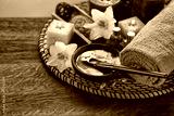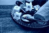 Spa chocolate set with candles on blurred background