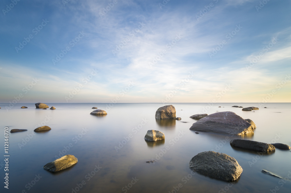 sea landscape, boulders in the water,sunset and colorful sky, slow shutter speed