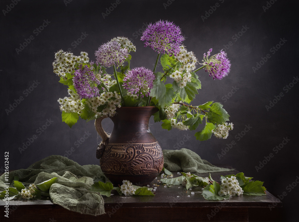 Still life with a bouquet of blooming hawthorn and ornamental onions in a clay jug on a dark background