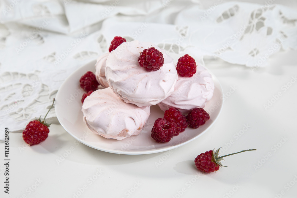 Marshmallow cookies with fresh raspberries for tea, selective focus