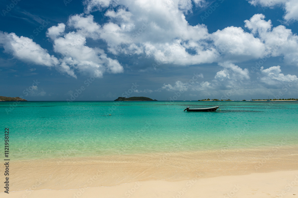 View across the tranquil turquoise lagoon at Carriacou's Paradise Beach to Mabouya Island and Sandy Island on the horizon.