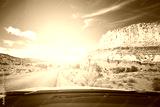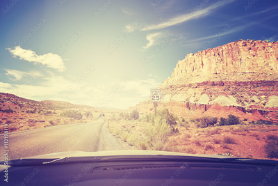 Vintage toned road against sun with speed limit sign, picture taken from inside a car.