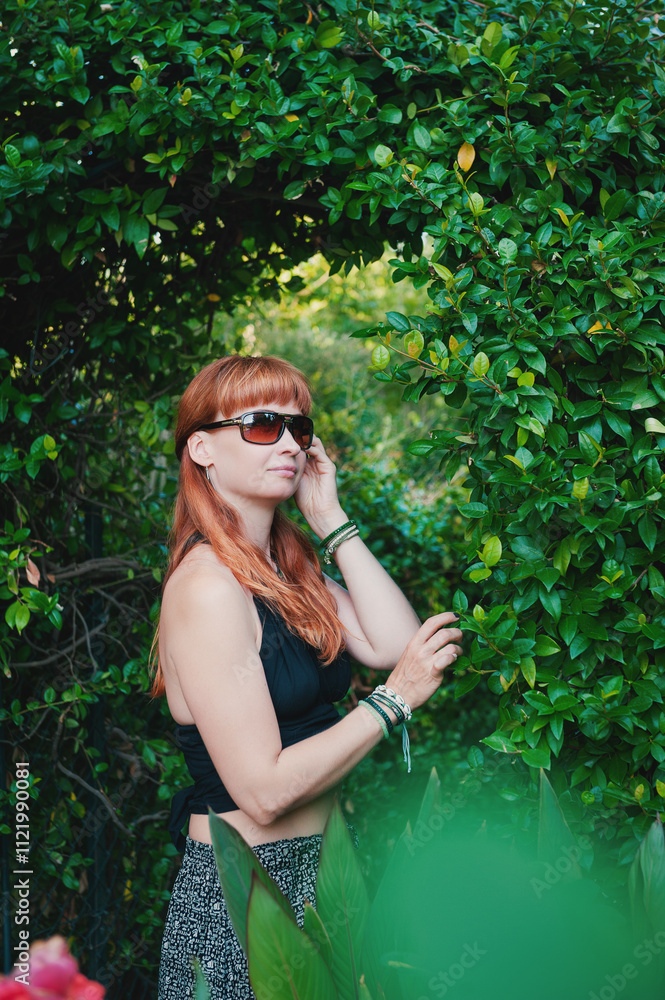 Stylish beautiful happy woman poses amid vibrant garden foliage