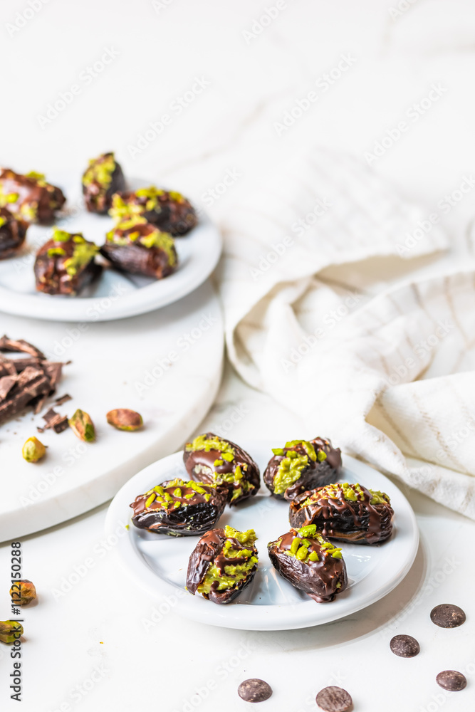 Dates filled with crunchy pistachio cream and covered in chocolate, Dubai chocolate dates, white background. Arranged with ingredients. Vertical.
