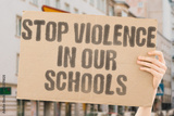 Banner reads 'Stop violence in our schools,' advocating for safety and mental health awareness. Safety. Education. Peace. Prevention. Awareness. Action. Harmony