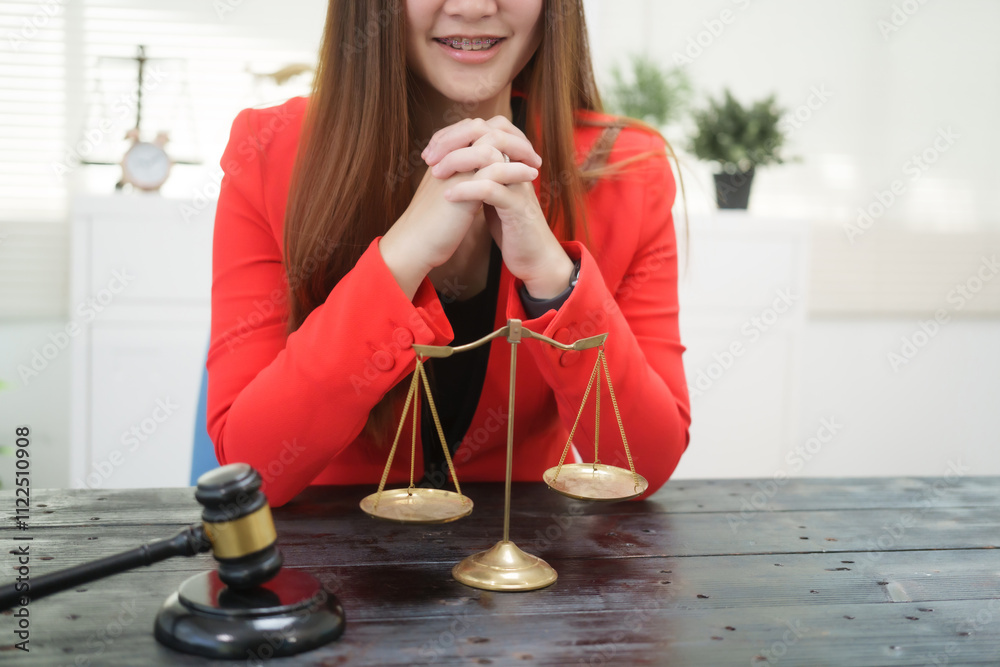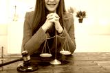A cheerful businesswoman smiles while holding a gavel at her desk, working as a legal consultant in an office, resolving civil disputes like debt cases, dismissals, foreclosures,and evictions online