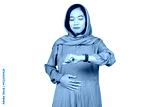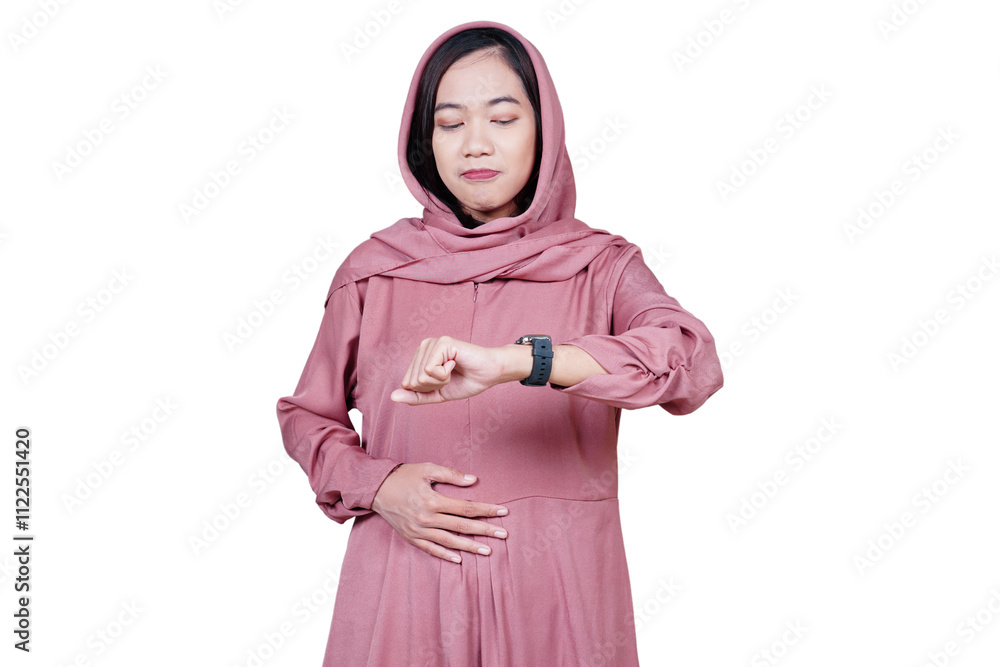 Asian Muslim woman holding alarm clock, waiting for Iftar time isolated transparent