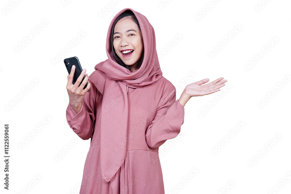 Asian Muslim woman holding phone, Ramadan theme, happy expression isolated transparent