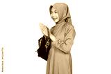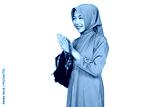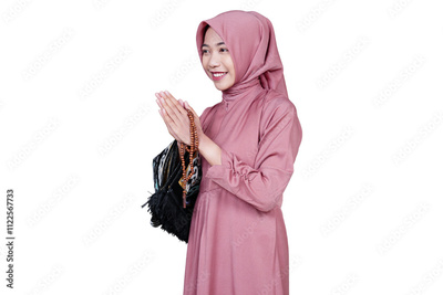 Asian Muslim woman in hijab with prayer beads, greeting gesture isolated transparent