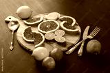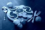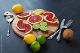 Citrus fruits arrangement with vintage silverware on black painted surface with back lighting.