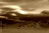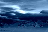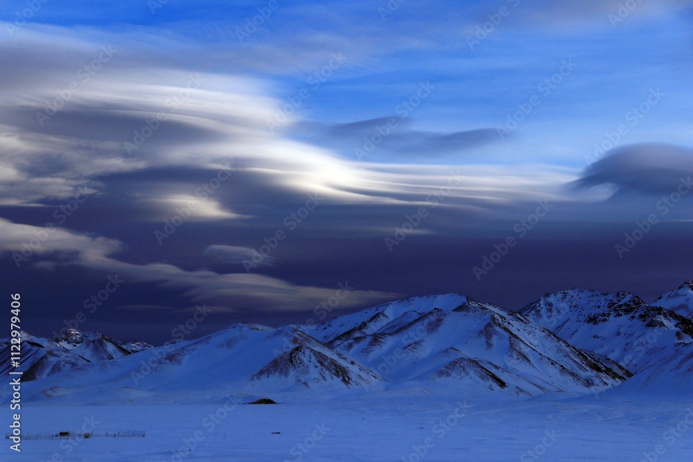 winter mountain landscape. Magical clouds in the mountains of Kyrgyzstan.