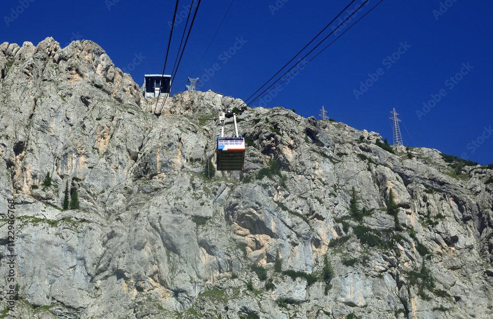 Aerial tramway for transporting people and goods to high altitude with very strong steel cables and a mountain wall