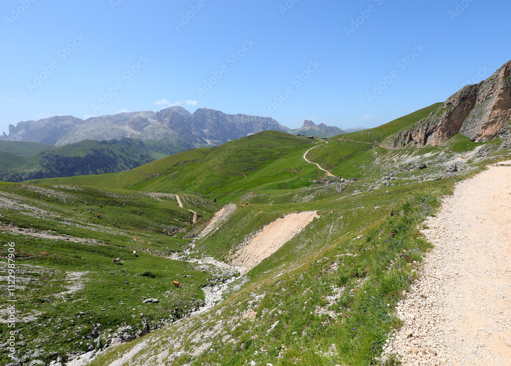 Path winding through valleys and alpine mountains in northern Italy at summer