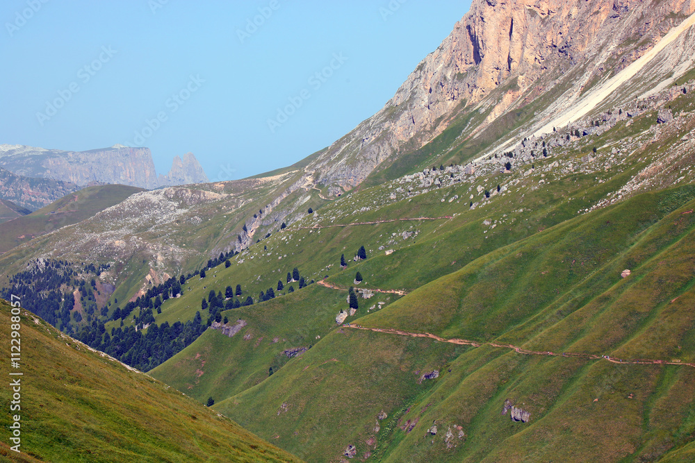 Trail that runs along the mountains in the European Alps in the Dolomite mountain range in Italy during the summer