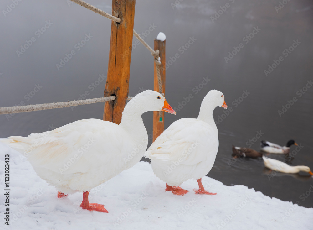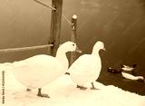ducks are standing on the pier