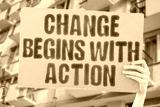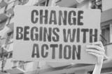 Banner says 'Change begins with action' inspiring steps toward a successful life and personal growth. Motivation. Progress. Drive. Determination. Purpose. Vision. Transformation