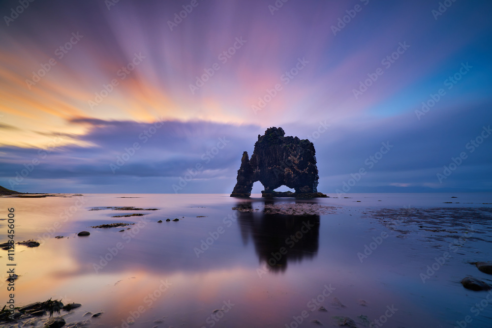 Beautiful summer scenery. Panoramic morning view of huge basalt stack - Hvitserkur. Breathtaking summer scene of eastern shore of the Vatnsnes peninsula, Iceland, Europe