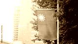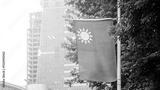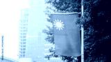 Taiwan flag with a green tree and city building in the background