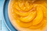 Peach, jelly dessert or cake. Homemade cheesecake with canned peaches on a blue plate