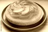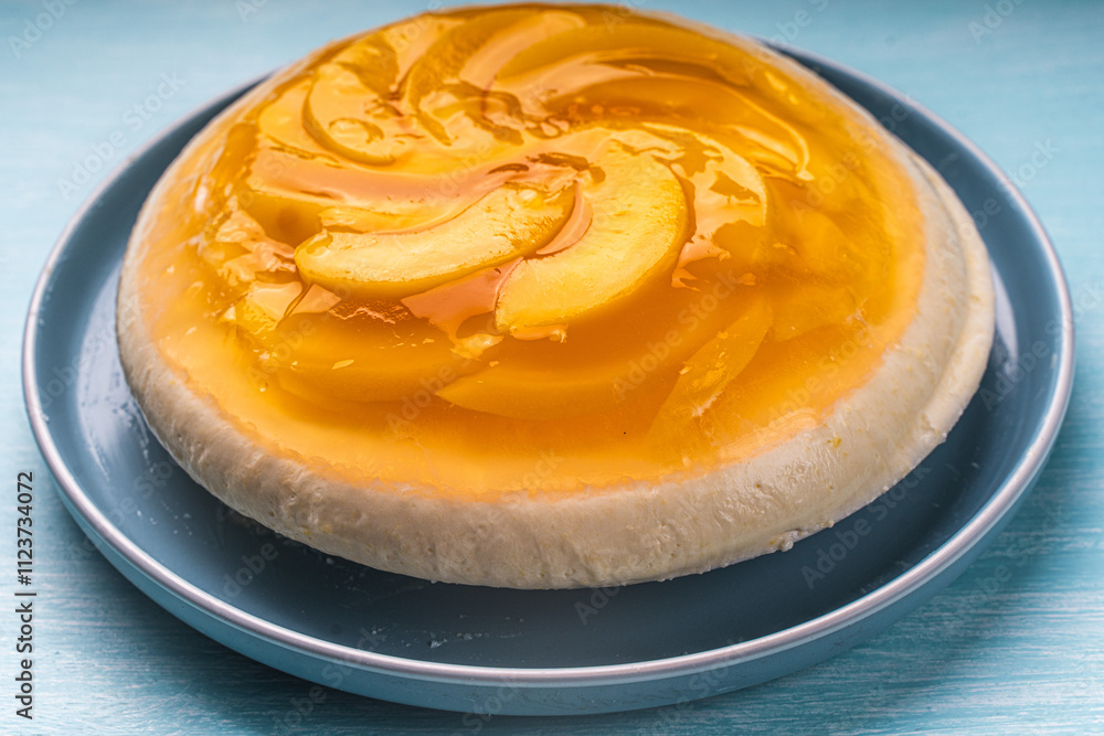 Peach, jelly dessert or cake. Homemade cheesecake with canned peaches on a blue plate