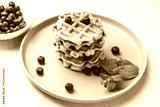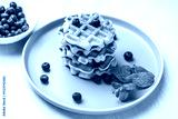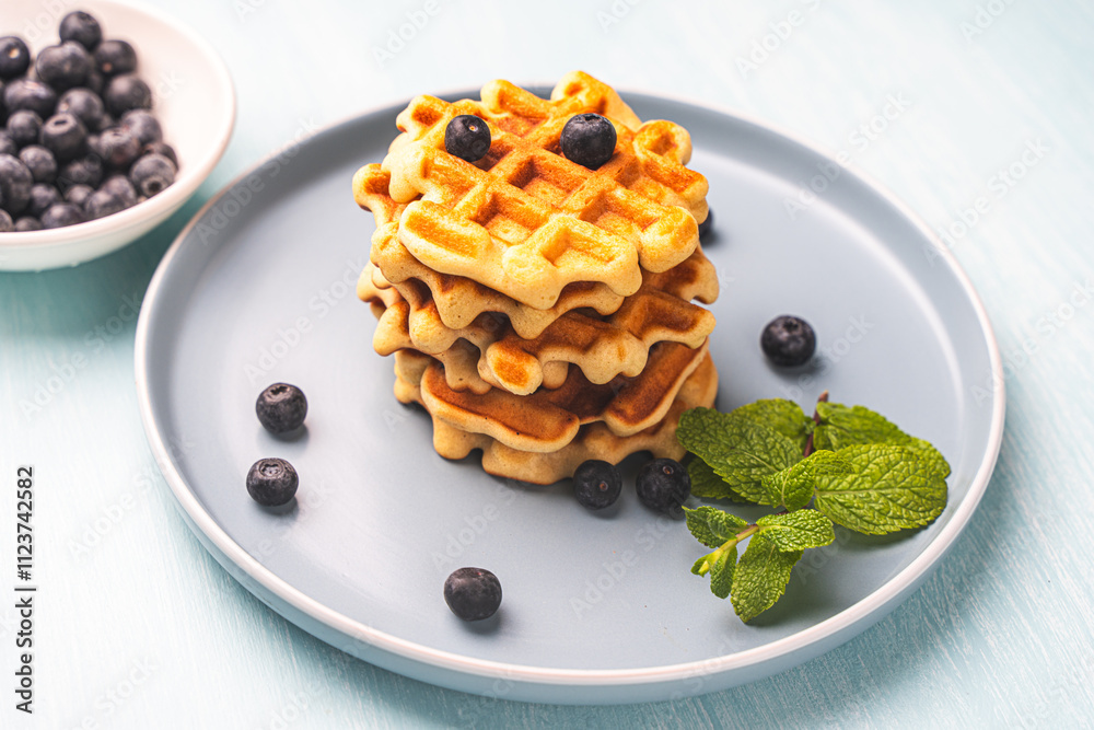 Two stacks of freshly baked Belgian or Viennese waffles with blueberries and mint on a blue plate.