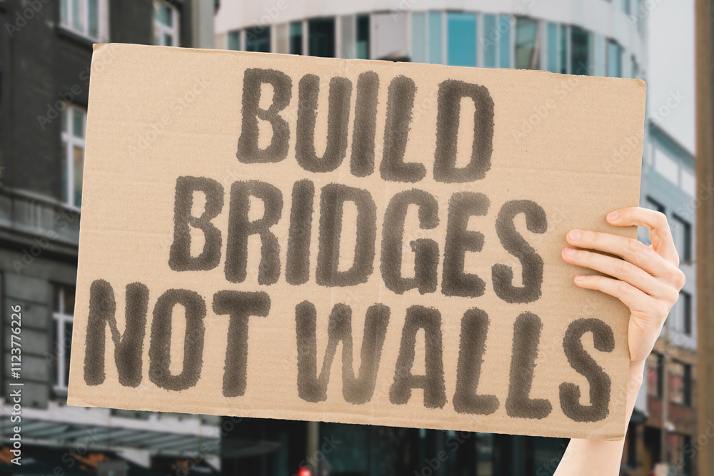 The banner reads 'Build bridges, not walls' encouraging unity and connection. Unity. Freedom. Migration. Connection. Friendship. Inclusion. Support