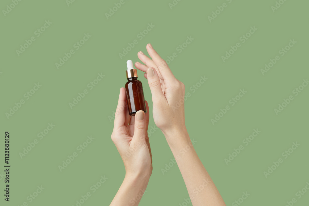 A womans hands holding a brown bottle of serum on a green background