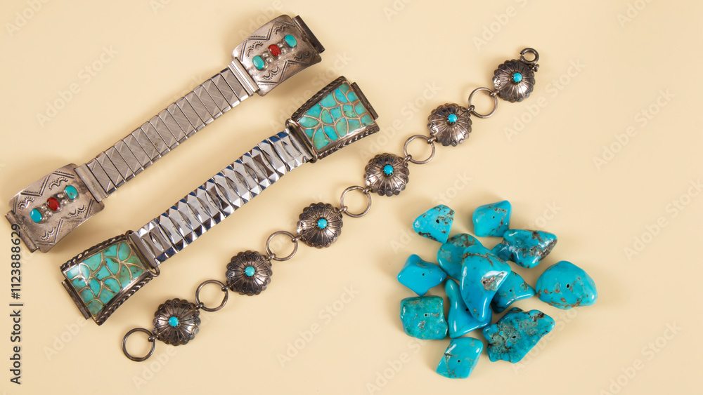 Old silver bracelets with blue American turquoise close up. Isolated jewelry with turquoise flat lay. Indian Navajo craftsmanship. Southwest amulet.