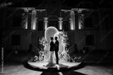 Silhouettes of bride and groom in front of a wedding arch decorated with flowers