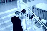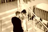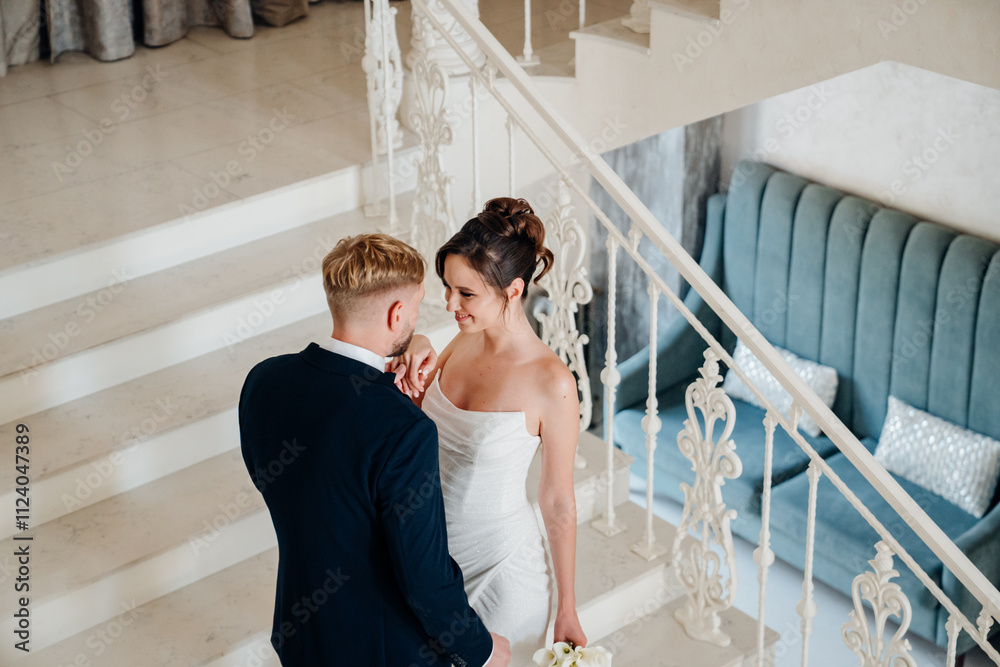 Beautiful and happy bride and groom on a large beautiful staircase.
