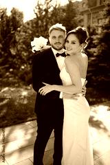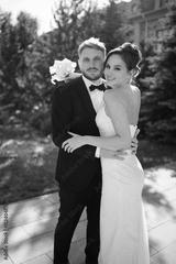 bride and groom cuddling in the autumn park on the territory of the hotel