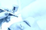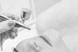 Caucasian female receiving professional facial treatment with airbrush device in spa setting.