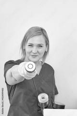 Female caucasian young healthcare worker holding medical device in professional setting.
