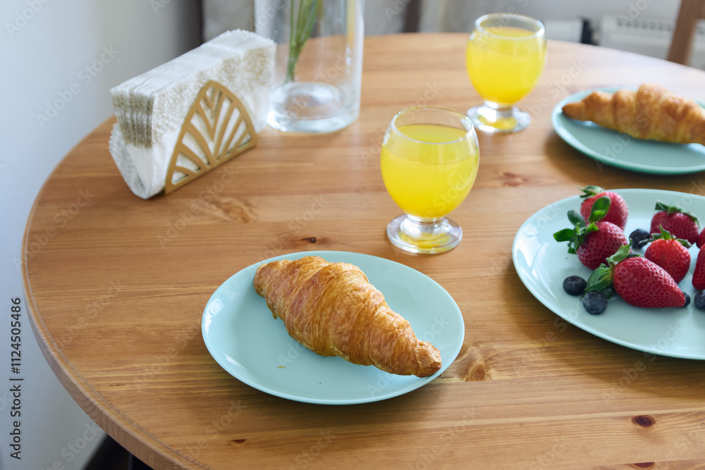 An Absolutely Delicious Breakfast Setting Featuring a Croissant and an Array of Fresh Fruits