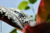 The mesmerizing sight of glittering raindrops adorning vibrant green leaves captivates all