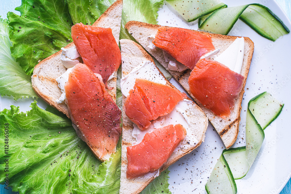 Sandwiches with cottage cheese and slices of salted trout on a white plate with cucumber and herbs