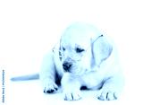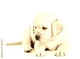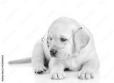 Smart Golden retriever puppy wearing eyeglasses looking away on empty space. isolated on white background