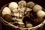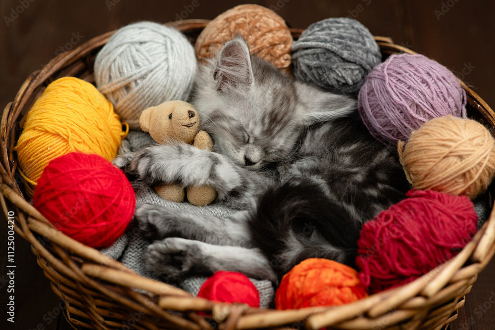 Cute tiny maine coon kitten hugs favorite toy bear and sleeps inside a basket with clews of thread. Top down view