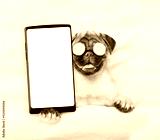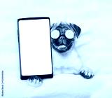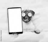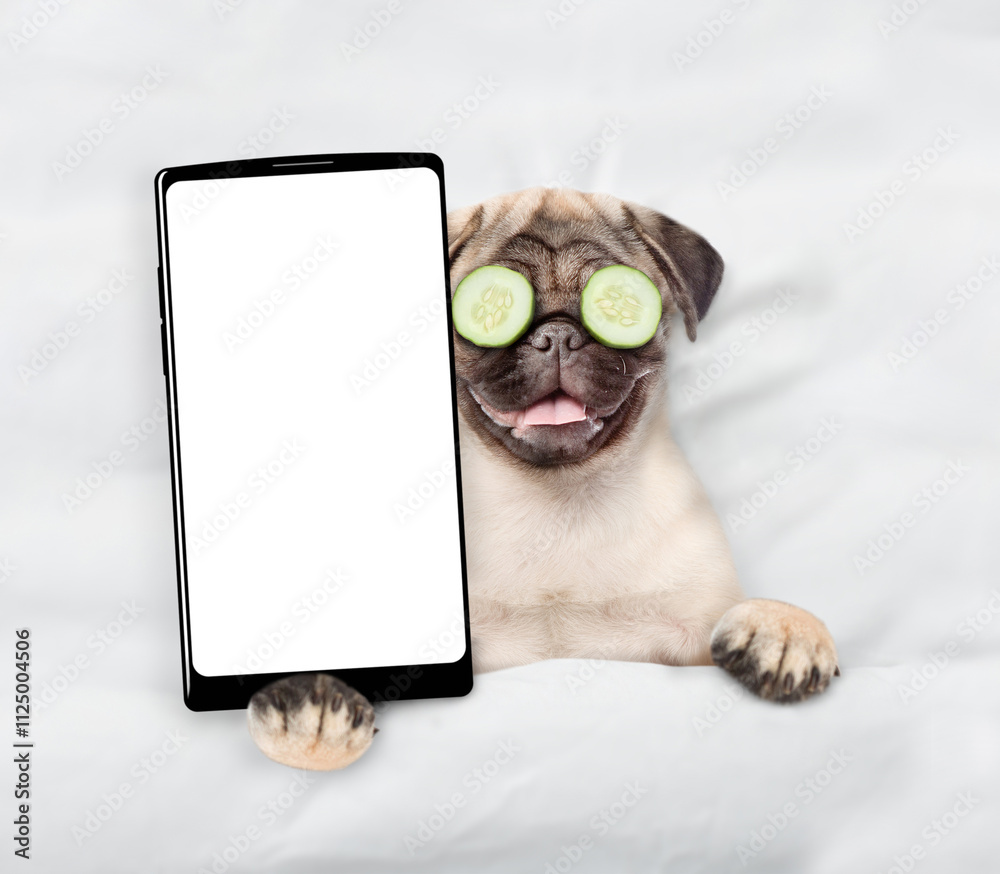 Funny Pug puppy with pieces of cucumber on his eyes relaxing on the bed at home and showing big smartphone with white blank screen. Top down view. Empty space for text