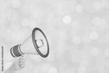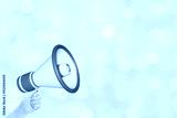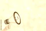 Womans hand holding megaphone on blurred yellow or golden festive background