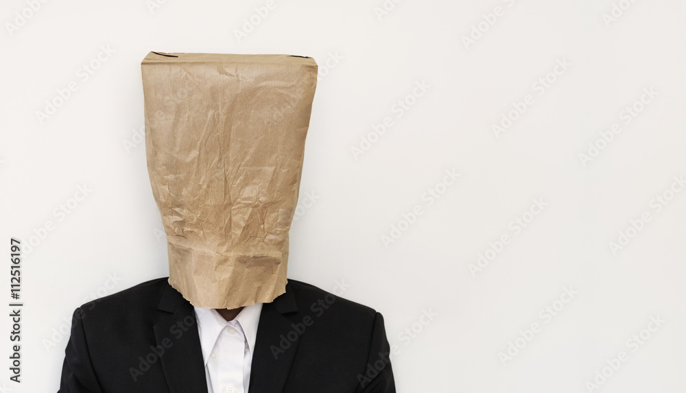 Businessman wearing brown paper bag