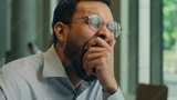 Sleepy tired exhausted lazy overworked man Indian Arabian businessman visitor customer in cafe morning work male freelancer business worker guy order food drink coffee in restaurant yawn lack sleep