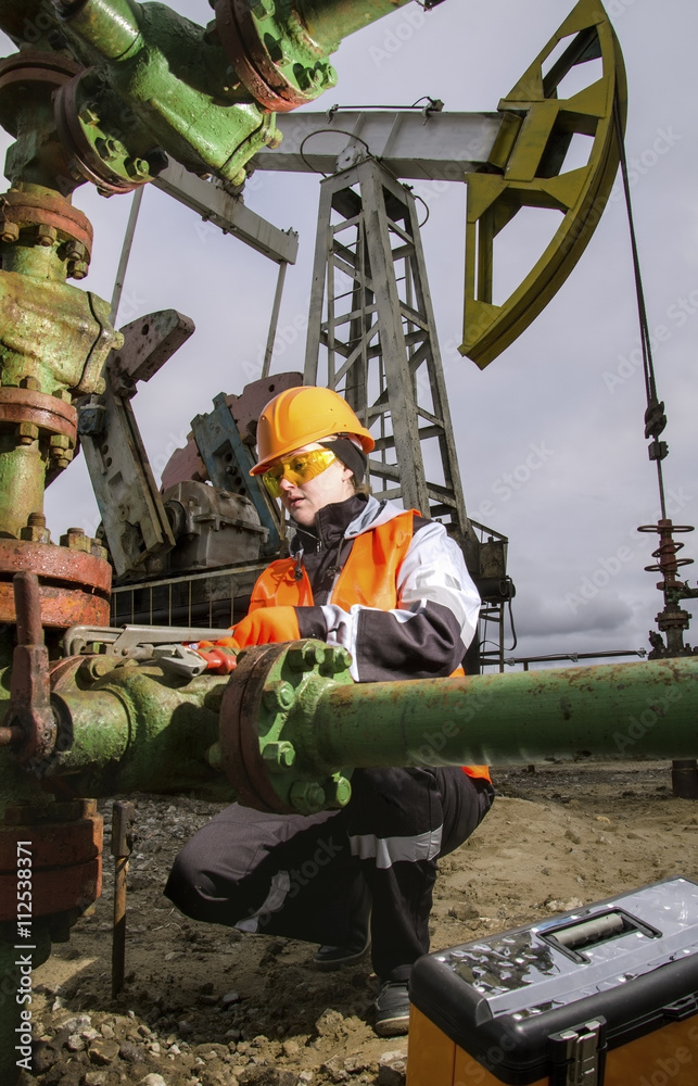 Woman engineer in the oil field repairing wellhead with the wrench wearing orange helmet and work clothes. Pump jack and tool box background. Oil and gas concept.